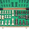 Фигуры изготовлены из дерева, выполнены в строго выдержанном классическом стиле. Высота короля 8 см, основание фигуры 3 см. Высота пешки 4 см, основание фигуры 2 см. Фигуры с войлочным основанием зеленого цвета. Фигуры с утяжелителем.