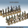 Шахматные каменные фигуры "Бородино" (без доски) — это набор тематических шахматных фигур, выполненных из искусственного камня (полистоун), расписанных вручную. Образы фигур представлены персонажами российской и французской армии времен Наполеоновских войн. Главные персонажи сражения при Бородино: Кутузов и Наполеон. Основание сделано из бархата чёрного цвета, что придает фигуре более устойчивое положение на доске и устраняет появление царапин при движении каменной фигуры по шахматному полю. Фигуры находятся в подарочной цветной коробке. Высота короля — 8.0 см. Диаметр основания — 2.5 см.Высота черного ферзя — 8.0 см. Высота белого ферзя — 7.5 см. Диаметр основания — 2.5 см.Высота черного слона — 7.0 см. Высота белого слона — 6.8 см. Диаметр основания — 2.5 см.Высота коня — 6.8 см. Диаметр основания — 2.5 см.Высота ладьи — 6.8 см. Диаметр основания — 2.5 см.Высота пешки — 6.2 см. Диаметр основания — 2.5 см.Вес комплекта фигур составляет 1 кг.Производство Китай.Наиболее гармоничное сочетание фигуры имеют с досками, размер клетки которых имеет от 4 x 4 до 5.8 x 5.8 кв сантиметров.Материал- искусственный камень полистоун.Ручная работа (роспись по камню).